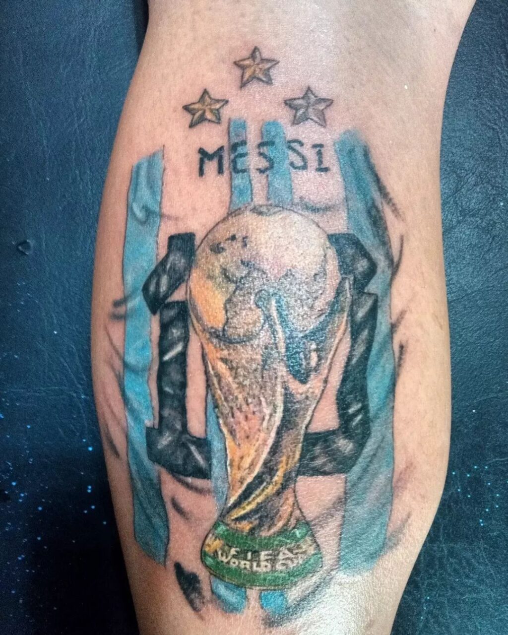La «fiebre» pos Mundial de Qatar continúa. Y los florenses siguen retratando en la piel la epopeya de «La Scaloneta». Los tatuadores no dan abasto y contaron a la 91.5 que han dado decenas de turnos de hinchas. Esta vez, el usuario @TotoLopez mostró en las redes un impecable trabajo del tatuador Adrián Arribillaga (foto). Se destaca en primer plano la Copa del Mundo y de fondo la 10 de Lionel Messi y las tres estrellas recordando los campeonatos mundiales ganados por la Argentina.