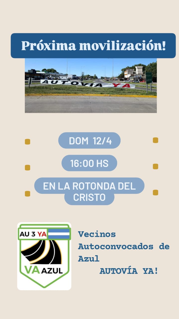 El grupo de Vecinos Autoconvocados de la vecina ciudad llevará a cabo el próximo domingo 12 de abril desde las 16hs. la segunda movilización del año. La misma será como siempre en la Rotonda del Cristo ubicada en Avda. Piazza y Ruta Nacional 3. Vale recordar que durante el 2025, los vecinos solicitaron en reiteradas ocasiones que la futura autovía incluya también el tramo Las Flores-Cacharí-Azul, inicialmente no previsto en el proceso de la Red Federal de Concesiones (Etapa II) además del adecuado mantenimiento del trazado actual ante el permanente riesgo que representa para quienes transitan por la zona.