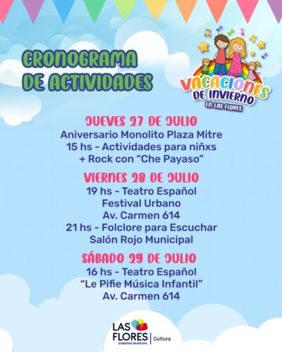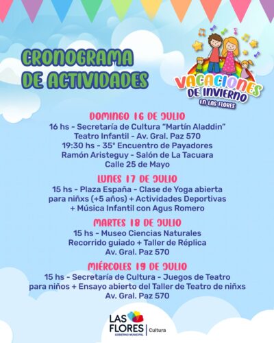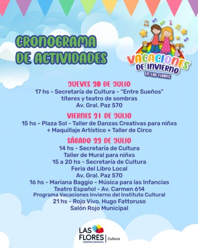 VACACIONES DE INVIERNO EN LAS FLORES: CONOCÉ TODAS LAS ACTIVIDADES QUE VAS A PODER DISFRUTAR Llegan las Vacaciones de Invierno a Las Flores y desde la Secretaría de Cultura tenemos propuestas para toda la familia. Del 16 al 29 de julio podrán disfrutar de música, títeres, teatro, circo, clases abiertas, actividades deportivas y bibliomovil, en diferentes espacios de la ciudad. Conoce la programación día a día. Todas las actividades para niñeces son abiertas y gratuitas. ¡Los esperamos!