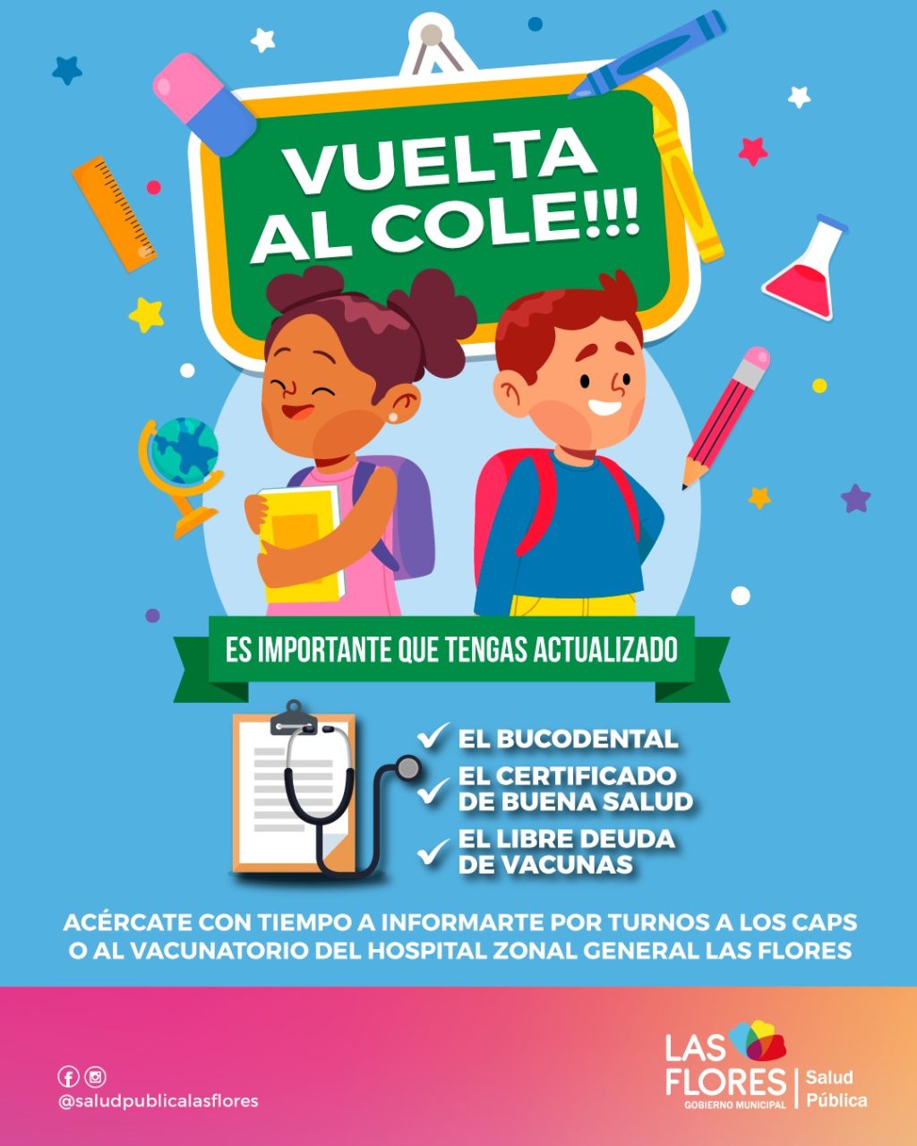 La Secretaría de Salud Pública les recuerda que estamos pronto al comienzo de clases y es importante organizarse con tiempo. Tené en cuenta contar con los Certificados de Buena Salud, que lo emite el pediatra o el médico generalista, el Bucodental y el Libre Deuda de Vacunas.