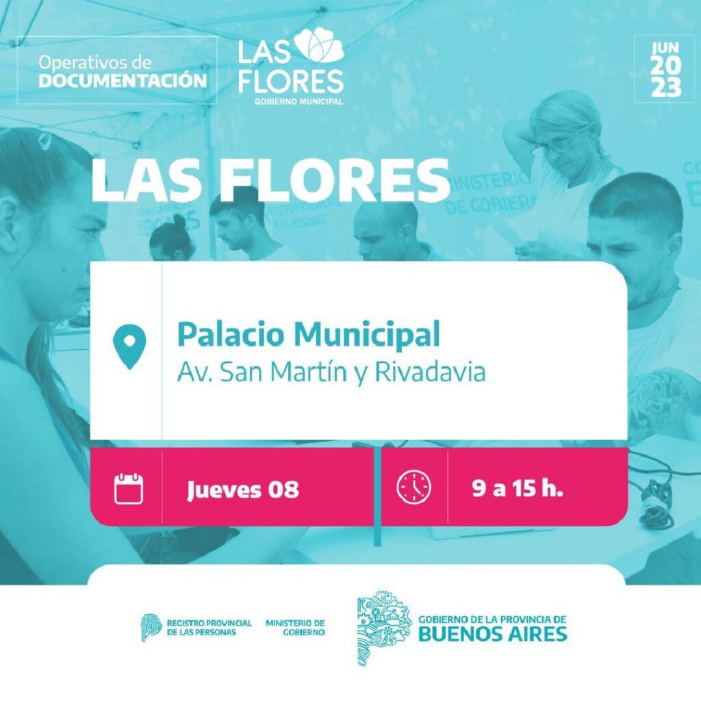 JUEVES 8 DE JUNIO OPERATIVO DE DOCUMENTACIÓN EN NUESTRA CIUDAD La Municipalidad de Las Flores informa que el próximo jueves 8 de junio el Registro Provincial de las Personas, dependiente del Ministerio de Gobierno de la provincia de Buenos Aires, realizará un Operativo de Documentación en nuestra ciudad. Estará ubicado en el Palacio Municipal (Av. Rivadavia y Av. San Martín) y el horario de atención será de 9 a 15 horas.