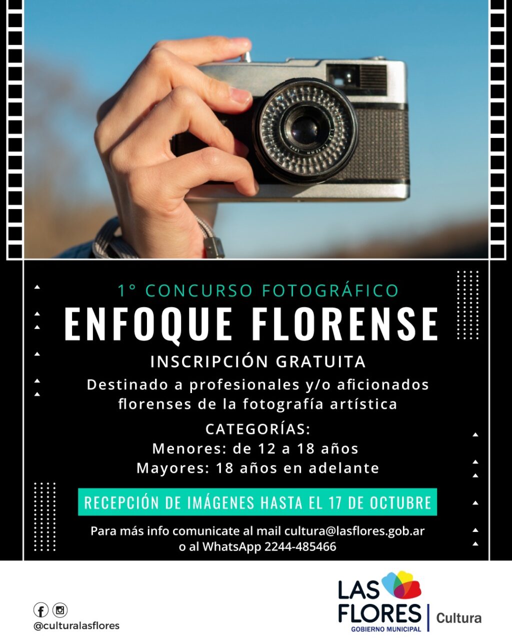 PRIMER CONCURSO FOTOGRÁFICO «ENFOQUE FLORENSE» La Dirección de Cultura de la ciudad de Las Flores convoca al 1° Concurso Fotográfico “Enfoque florense” destinado a profesionales y/o aficionados florenses de la fotografía artística. La inscripción en el Concurso tiene por objeto estimular la creatividad, propiciar las producciones artísticas independientes, divulgar aspectos y costumbres sociales y promover la difusión y conservación del patrimonio cultural de nuestra Ciudad. El tema del presente concurso es libre, aunque las tomas deben ser específicas del Partido de Las Flores. Existirán dos categorías: Menores: de 12 a 18 años y Mayores: 18 años en adelante. La recepción de imágenes será hasta el 17 de octubre de 2025. Para acceder a las Bases completas, ingresar a https://lasflores.gob.ar/bases-y-condiciones-enfoque-florense/