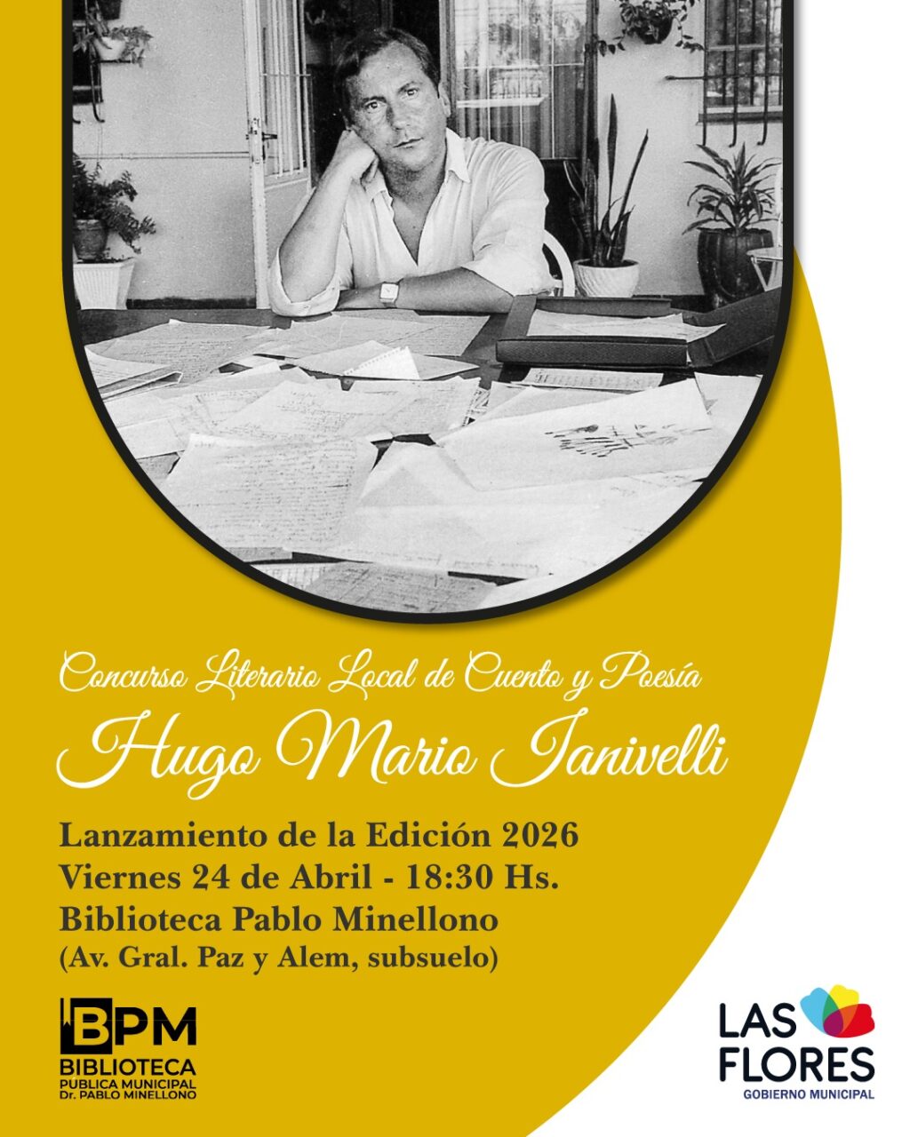 LANZAMIENTO DE LA EDICIÓN 2026 DEL CONCURSO LITERARIO LOCAL “HUGO MARIO IANIVELLI” Este viernes 24 de abril a las 18.30 horas en la Biblioteca Municipal Pablo Minellono (Avda. General Paz y Alem, subsuelo) tendrá lugar el acto de presentación del Concurso Literario Local de Cuento y Poesía «Hugo Mario Ianivelli» que este año celebra su edición número 51. La ceremonia se realizará, como siempre, en el marco de la Semana de la Lengua Española y, a su vez, en virtud de la cercanía con el aniversario de nacimiento de Alejandra Pizarnik, se inaugurará una exposición alusiva a la poeta.