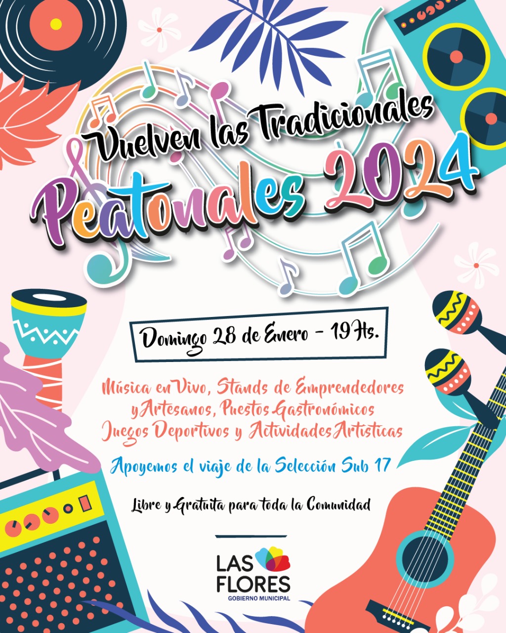 PEATONALES 2024: ESTE DOMINGO 28 EN EL CENTRO DE LA CIUDAD Este domingo 28 de enero desde las 19 horas en el centro de la ciudad, la comunidad podrá disfrutar de la jornada de inicio de las Peatonales Culturales 2024. Este evento tendrá además un tinte colaborativo debido a que estará incluida la posibilidad de contribuir con la Selección Sub 17 de fútbol de Las Flores que representará a la ciudad en un importante torneo que se realizará en Brasil. Las Peatonales Culturales llegan este año con la presencia de actividades artísticas y juegos deportivos de las áreas de Deportes y Cultura; artesanos y emprendedores locales; puestos gastronómicos; y en el escenario principal, varios serán los artistas que le pondrán música a las noches de verano. Actuarán: Luis Álvarez, Taller de Canto Interpretativo “La Voz Diferente”, presenta a Mariana Minoli y Gonzalo Petreigne; The Factory Crew; La Patio I’ Tierra; Chato + Luna Negra. Es importante destacar que, para colaborar con el equipo de la Selección Juvenil, quienes lo deseen podrán llevar una llave que no usen para ser depositada en los stands que estarán en el lugar. Las Peatonales 2024, organizadas por la Municipalidad de Las Flores, tan esperadas por la comunidad, vuelven con toda su energía.