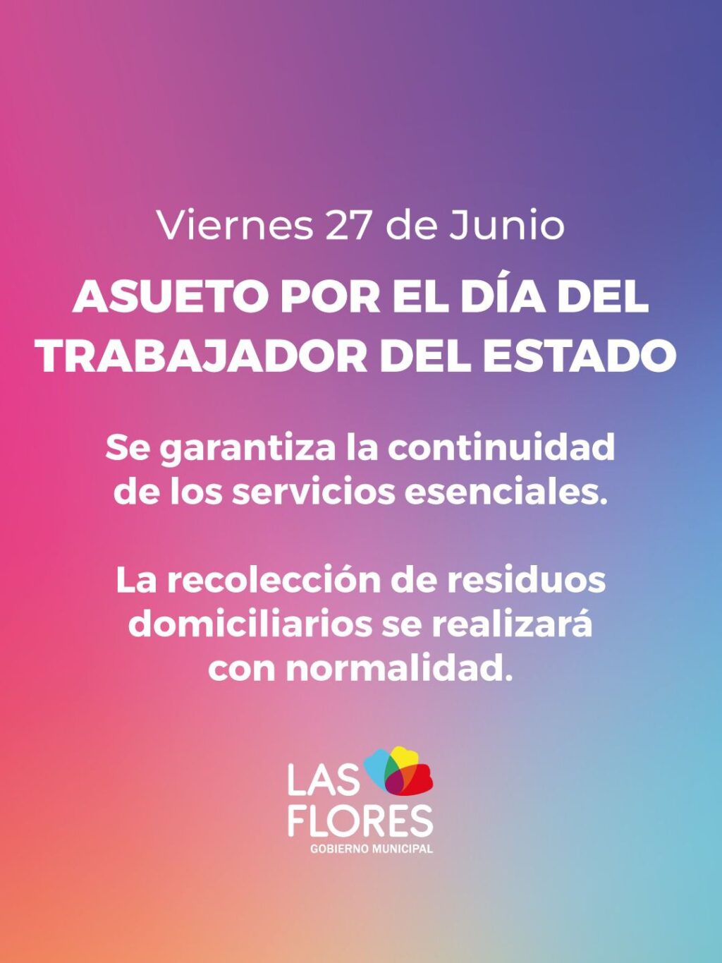 ASUETO POR EL DÍA DEL TRABAJADOR DEL ESTADO Informamos que tal como establece el Decreto del Ejecutivo Municipal y la normativa correspondiente, mañana viernes 27 de junio habrá Asueto con motivo del Día del Trabajador del Estado por lo que no habrá actividad en las dependencias municipales. Al respecto también se comunica que serán garantizados los servicios esenciales de cada área. La Recolección Nocturna de Residuos Domiciliarios se realizará con normalidad.