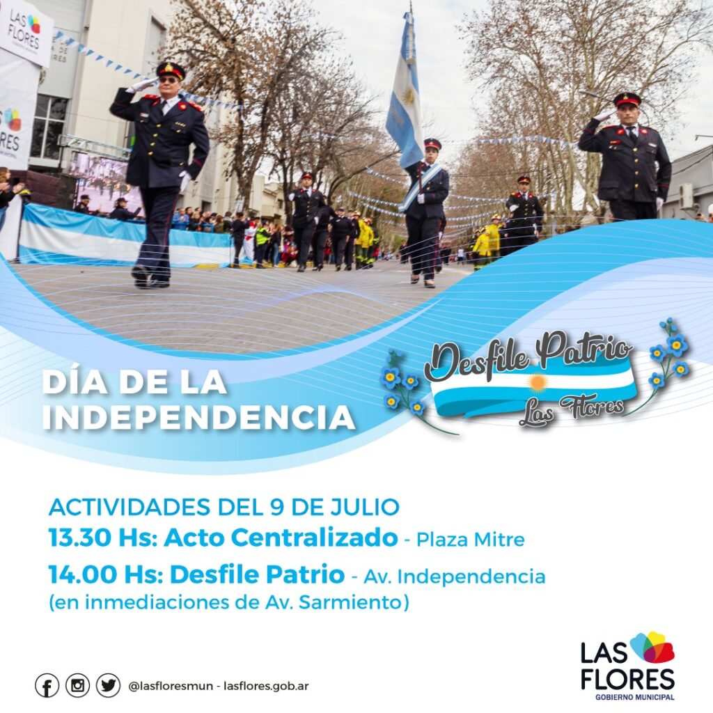 ACTIVIDADES DEL 9 DE JULIO – DÍA DE LA INDEPENDENCIA Con motivo de conmemorarse el 207° aniversario de la Declaración de nuestra Independencia, la Municipalidad de Las Flores invita a la comunidad a las actividades programadas para el próximo domingo 9 de julio. El Acto Centralizado se llevará a cabo a las 13.30 horas en Plaza Mitre. Posteriormente, a las 14 horas se realizará el Desfile Patrio con la presencia de diversas instituciones y entidades florenses. Será en la Av. Independencia (en inmediaciones a la Av. Sarmiento) donde se dará por inaugurada la obra de pavimentación de dicha circunvalación de la ciudad.