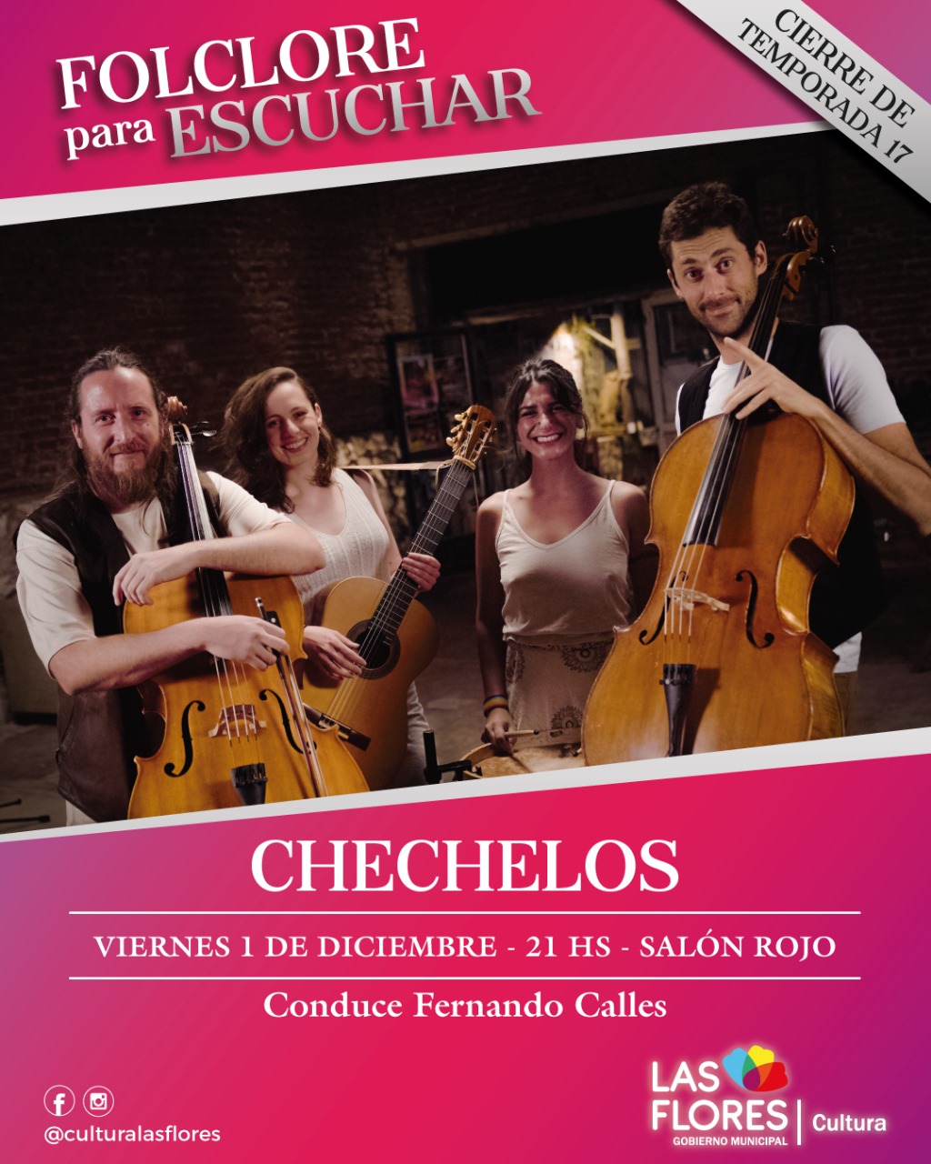 FOLCLORE PARA ESCUCHAR CIERRA SU 17° TEMPORADA CON LA PRESENTACIÓN DE “CHECHELOS” Mañana viernes 1° de diciembre a las 21 horas, el ciclo «Folclore para Escuchar» cerrará su 17° temporada con un espectáculo artístico de alto vuelo. “Chechelos”, folclore argentino y del bueno, sonará fuerte en el Salón Rojo Municipal, en un evento ideado y conducido por Fernando Calles con apoyo de la Secretaría de Cultura.