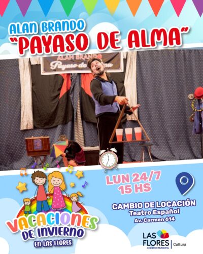 VACACIONES DE INVIERNO EN LAS FLORES: Hoy Lunes 24!!! Alan Brando “Payaso de Alma”. 15 horas. TEATRO ESPAÑOL.