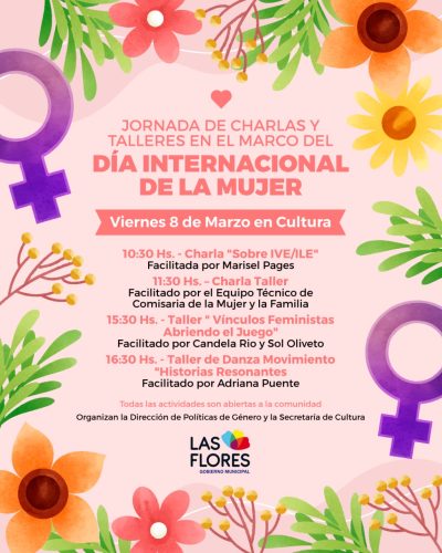 JORNADA DE CHARLAS Y TALLERES EN EL MARCO DEL DÍA INTERNACIONAL DE LA MUJER Desde la Dirección de Políticas de Género, Diversidad y Prevención de la Violencia y la Secretaría de Cultura se invita a toda la comunidad a participar de la Jornada de Charlas y Talleres a realizarse el 8 de marzo en el marco del Día Internacional de la Mujer, fecha de conmemoración de la lucha por los derechos referentes a la igualdad y garantización de vidas íntegras. Las mismas son abiertas a toda la comunidad, brindadas por profesionales locales y tienen por objetivo ofrecer información, asesoramiento y espacios de concientización y reflexión respecto a las actuales necesidades en los procesos de empoderamiento y prevención de la violencia. Las actividades serán en la Secretaría de Cultura (Av. Gral. Paz 570) desde las 10.30 horas.