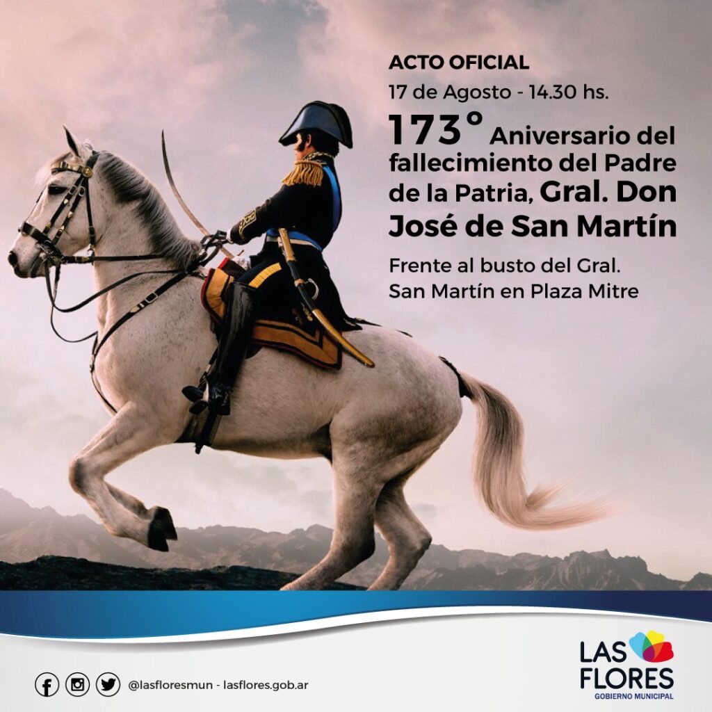 ACTO CENTRALIZADO EN HOMENAJE AL GRAL. SAN MARTÍN Este jueves 17 de agosto se realizará el Acto Centralizado al recordarse el 173° aniversario del fallecimiento del Gral. Don José de San Martín. La conmemoración será a partir de las 14.30 horas en el busto homenaje al Padre de la Patria ubicado en Plaza Mitre (esquina de Av. San Martín y Av. Rivadavia). Se extiende la invitación a representantes de diferentes instituciones educativas, sociales e intermedias y a todos los vecinos de nuestra comunidad.