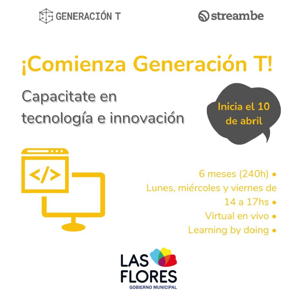 PROPUESTA DE CAPACITACIÓN EN PROGRAMACIÓN PARA ESTUDIANTES DE ÚLTIMOS AÑOS DE SECUNDARIA El Área de Juventudes en articulación con la Secretaría de Educación comunican que se encuentra abierta la inscripción a Generación T, una iniciativa educativa online y gratuita con impacto social creada por Streambe para abrirle las puertas del mundo Tech a estudiantes de los últimos dos años de la secundaria o institutos técnicos de la República Argentina, en el marco del sistema de Prácticas Profesionalizantes para instituciones educativas tanto de gestión pública como privada. Streambe es empresa oferente registrada en el sistema de Prácticas Formativa del Consejo Provincial de Educación y Trabajo (COPRET) bajo el n° 12486. Generación T es una propuesta educativa a la medida de la industria IT y con los cimientos para que puedan seguir estudiando en universidades argentinas y alcanzar sólidos conocimientos que les permitan elevar su carrera profesional. El programa tiene una duración total de 7 meses (240 horas) con clases los lunes, miércoles y viernes de 13 a 17 horas con la posibilidad de realizarlo de manera asincrónica. Los alumnos aprenderán habilidades técnicas-tecnologías para el desarrollo de sitios y aplicaciones web: Full Stack y habilidades blandas para que las utilicen a la hora de resolver sus desafíos laborales que también les servirán para distintos ámbitos de su vida.