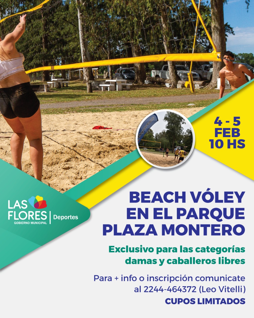 SE REALIZARÁ UN CAMPEONATO DE BEACH VÓLEY EN EL PARQUE PLAZA MONTERO El sábado 4 y domingo 5 de febrero tendrá lugar en la cancha de beach vóley del Parque Plaza Montero un campeonato exclusivo para las categorías damas y caballeros libres, organizado por la Leonel Vitelli quien pertenece al equipo de trabajo de la Secretaría de Deportes. La actividad se pondrá en marcha a partir de las 10 horas, dividiéndose el certamen en zonas clasificatorias donde además de sus respectivas finales, también habrá encuentros por la tercera y cuarta ubicación. Cabe destacar que los cupos son limitados y el evento genera una interesante expectativa, ya que se espera la participación de importantes duplas zonales y locales. Por informes o inscripción, los interesados deberán comunicarse al 02244-464372 (Leo Vitelli).