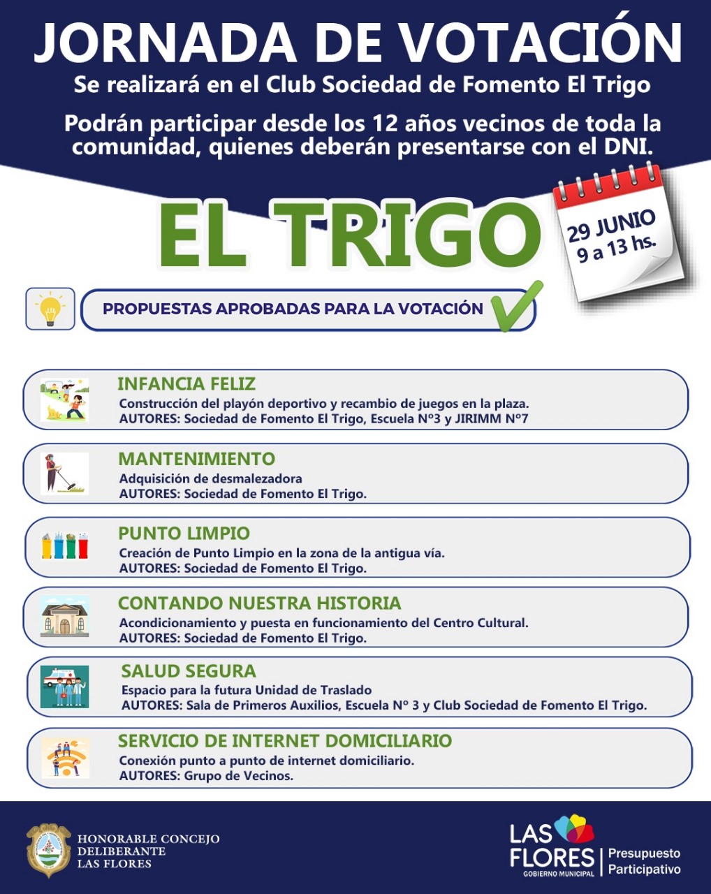 PRESUPUESTO PARTICIPATIVO: EL SÁBADO 29 SE REALIZARÁ LA JORNADA DE VOTACIÓN EN EL TRIGO Este sábado 29 de junio tendrá lugar la jornada de votación del Presupuesto Participativo en el Paraje El Trigo. Como ya se llevó adelante días atrás en Pardo, esta etapa se realiza luego de las distintas recorridas y encuentros con la comunidad, las reuniones de la Mesa de Organización y Seguimiento, la presentación de los proyectos por parte de los ciudadanos y el análisis técnico-presupuestario de los mismos. La jornada se realizará en el Club Sociedad de Fomento desde las 9 hasta las 13 horas. Todas las personas mayores de 12 años que quieran ser parte, deberán presentarse con DNI y podrán elegir entre las propuestas presentadas por los vecinos que son: