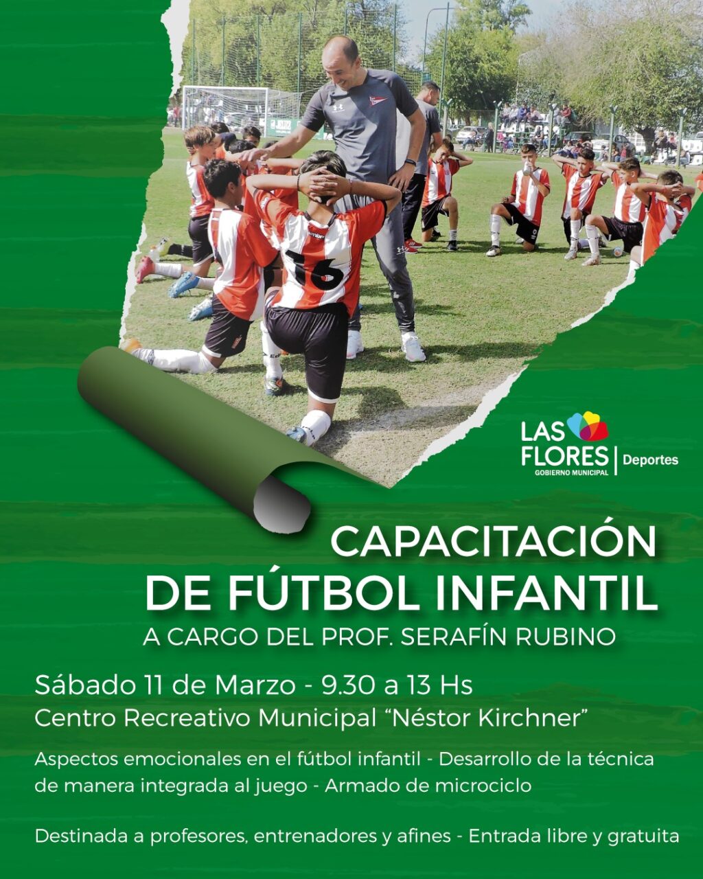 CAPACITACIÓN DE FÚTBOL INFANTIL A CARGO DEL PROFESOR SERAFÍN RUBINO La Secretaría de Deportes informa que el sábado 11 de marzo, en el horario de 9.30 a 13 horas aproximadamente, el profesor Serafín Rubino dictará una capacitación de fútbol infantil en el Centro Recreativo Municipal “Néstor Kirchner”. El florense, actual preparador físico de la prenovena (clase 2010) del Club Estudiantes de La Plata, abordará los siguientes puntos: a) Aspectos emocionales en el fútbol infantil. b) Desarrollo de la técnica de manera integrada al juego. c) Armado de microciclo. La disertación está destinada a profesores, entrenadores y afines, siendo la entrada libre y gratuita.