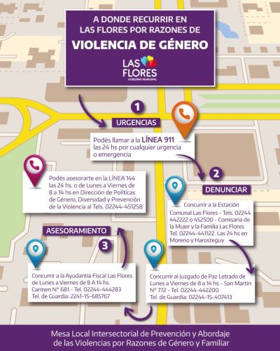 A DÓNDE RECURRIR EN LAS FLORES POR RAZONES DE VIOLENCIA DE GÉNERO Desde la Mesa Local Intersectorial de Prevención y Atención de la Violencia por Motivos de Género se brinda la información para saber a dónde recurrir ante episodios de violencia.