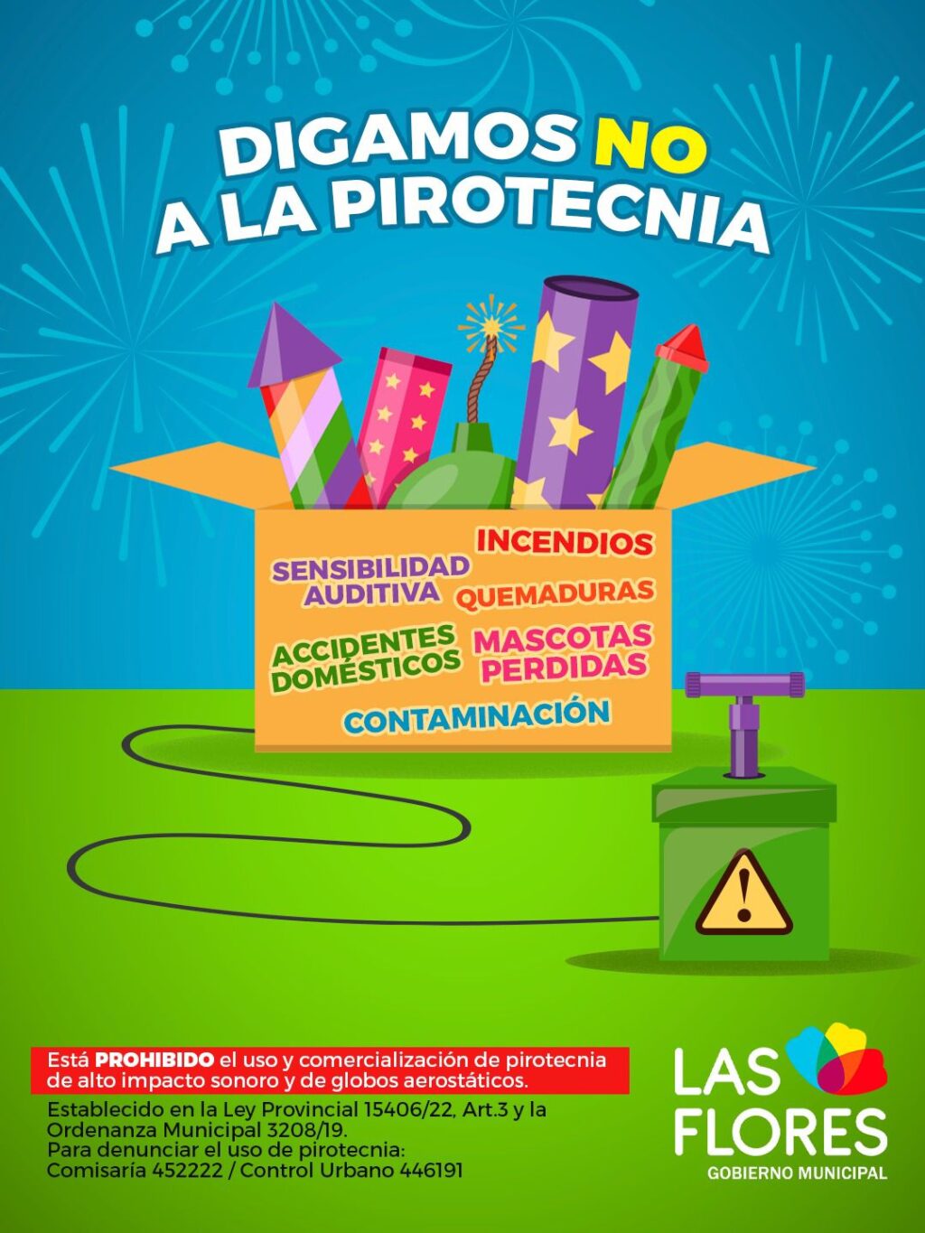 IMPORTANTE Desde la Municipalidad de Las Flores se recuerda que está prohibido el uso y comercialización de pirotecnia de alto impacto sonoro y de globos aerostáticos de acuerdo a lo establecido en la Ley Provincial 15406/22, Art.3 y Ordenanza Municipal 3208/19. Para denunciar el uso de pirotecnia: Comisaría 452222 / Control Urbano 446191. Para más información contactarse con el Área de Cuidado Animal al 2244-442236 o 2244-15-466040.