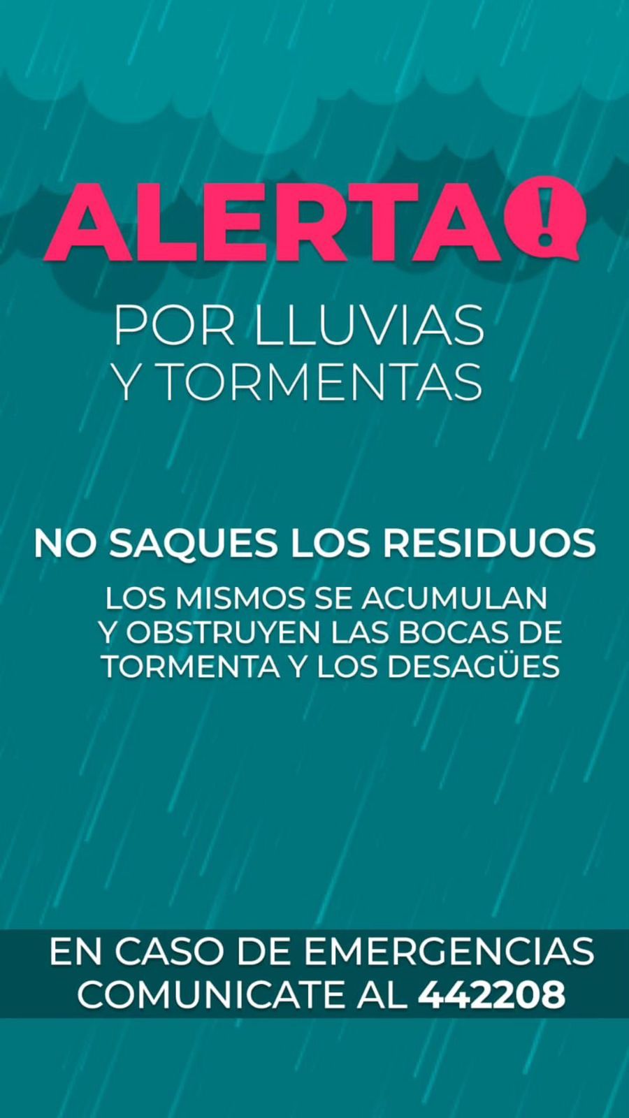 PRECAUCIÓN ANTE EL ALERTA POR LLUVIAS Y TORMENTAS Se solicita a la población mantener las precauciones ante el alerta por lluvias y tormentas para nuestro Partido y la zona durante las próximas horas. Además, se informa sobre la importancia de no sacar a la vía publica residuos domiciliarios y voluminosos, para evitar la acumulación y obstrucción en las bocas de tormenta y desagües. En caso de emergencias, comunicarse al teléfono Futurtel 44-2208 (Corralón Municipal).
