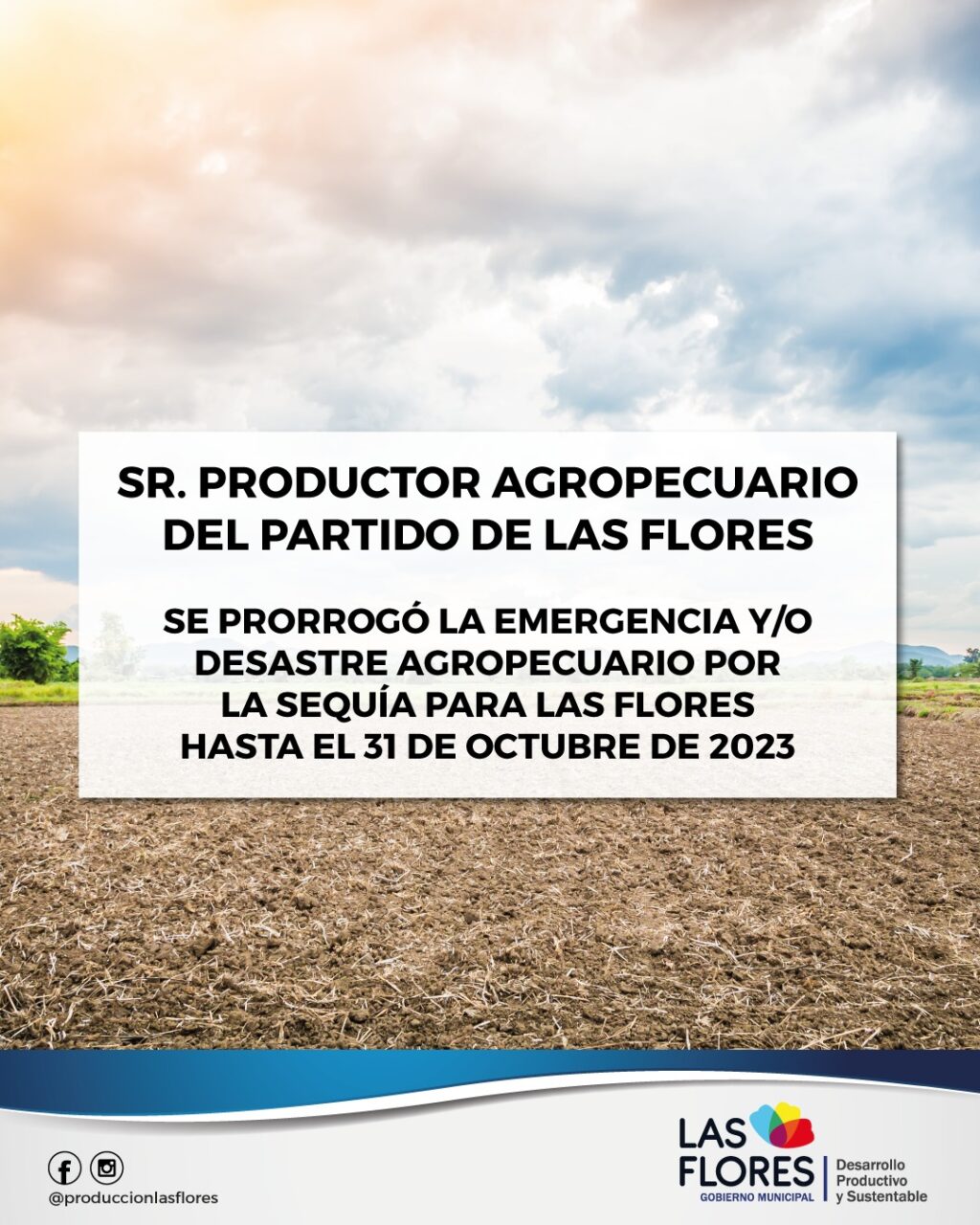 SE PRORROGÓ LA EMERGENCIA Y/O DESASTRE AGROPECUARIO POR LA SEQUÍA PARA LAS FLORES La Dirección de Asuntos Agropecuarios, dependiente de la Secretaría de Desarrollo Productivo y Sustentable, informa que se prorrogó la emergencia y/o desastre agropecuario por la sequía para el partido de Las Flores, desde el día 1 de abril, hasta el 31 de octubre de 2023. La prórroga, fue solicitada por la Municipalidad de Las Flores y la Comisión Local de Asuntos Agropecuarios, a raíz de la continuidad de la grave sequía que atraviesa el Partido de Las Flores. La misma fue tratada y aprobada en la reunión del CEDABA provincial, a través del decreto 539/23. Aquellos productores/as que quieran tramitar la declaración de emergencia para su establecimiento, pueden hacerlo hasta el día 20 de octubre 2023. Y aquellos productores, que ya tienen su certificado de emergencia agropecuaria, pueden solicitar la rectificación para prorrogar emergencia agropecuaria en su establecimiento, hasta el día 20 de octubre de 2023. En ambos casos, deben completar una declaración jurada que la pueden solicitar en la oficina de la Secretaría de Desarrollo Productivo y Sustentable Av. Manuel V. Paz 1.114, al mail desarrolloproductivo@lasflores.gob.ar, o al WhatsApp 2244-448030, de lunes a viernes de 6.30 a 12 hs.