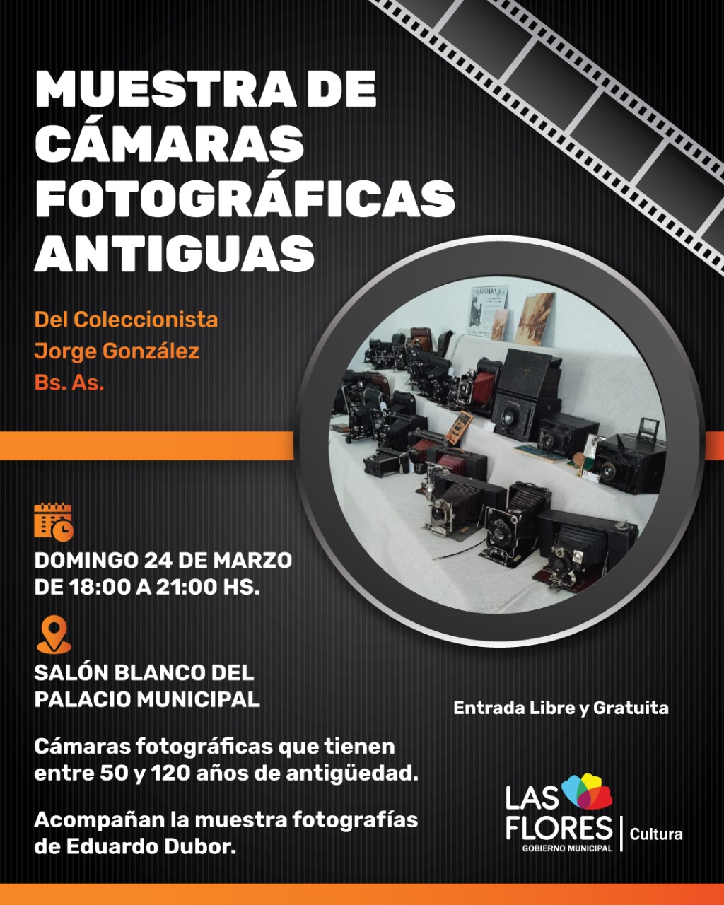 IMPERDIBLE MUESTRA DE CÁMARAS FOTOGRÁFICAS ANTIGUAS El próximo domingo 24 de marzo de 18 a 21 horas en el Salón Blanco del Palacio Municipal, la Secretaría de Deportes y Cultura, en forma conjunta con el coleccionista Jorge González, presentará una destacada exhibición de cámaras fotográficas que tienen entre 50 y 120 años de antigüedad. Ninguna de las cámaras está restaurada y todas muestran los signos normales del desgaste por el paso del tiempo. Jorge González sostiene que su colección rinde homenaje a los miles de trabajadores e ingenieros que, durante más de cien años, han diseñado y producido cámaras y equipos que sentaron las bases y las normas de la fotografía del presente. Estas reliquias tecnológicas transportarán al espectador a épocas pasadas, una conexión entre la fotografía y la historia. Acompañarán la muestra de cámaras antiguas de Jorge González, fotografías de Eduardo Dubor relacionadas con la historia de Las Flores y de nuestro país. Con entrada libre y gratuita, se invita a toda la comunidad a presenciar esta exhibición de equipos gráficos que Jorge González con pasión logró coleccionar durante años.