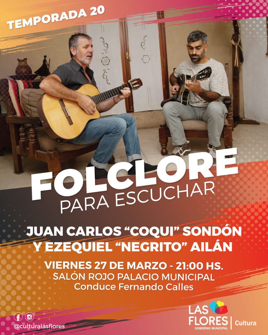 HOY VIERNES 27 TENDRÁ SU INICIO LA 20° TEMPORADA CONSECUTIVA DE FOLCLORE PARA ESCUCHAR Este viernes 27 de marzo a las 21 horas dará comienzo la 20° temporada consecutiva de “Folclore para Escuchar”. El ciclo, una idea y realización de Fernando Calles, con el apoyo de la Secretaría de Educación y Cultura Municipal, sigue comprometido con la comunidad florense en su tarea de presentar artistas destacados de nuestra música. En ésta oportunidad, la idea es poner en valor la participación de cantautores florenses que estuvieron participando en el prestigioso Certamen “Pre Cosquín” ya que, en su versión 2026, lograron llegar con sus obras a la final de dicha competencia. Juan Carlos “Coqui” Sondón y Ezequiel “Negrito” Ailán participaron en el rubro “Canción Inédita” y, por elección del jurado, quedaron entre los finalistas destacados del certamen. Dicho así, parece simple la historia, pero detrás de una competencia de éstas características, hay mucho de compromiso por parte de cada artista, más cuando se presenta una canción propia, desconocida masivamente, a la que hay que presentar, primero, y defender, después. El jurado evalúa, seguramente, contenido poético, musical y, como ya fue expresado, el compromiso en la interpretación. Por estas razones, es que la producción de “Folclore para Escuchar” ha decidido, en el comienzo de un nuevo año, brindarles el tradicional espacio del Salón Rojo para que Coqui y Ezequiel puedan expresar su arte, como lo hicieron en el escenario “Atahualpa Yupanqui” en la Plaza Próspero Molina. La cita es el viernes 27, desde las 21 horas en el Salón Rojo Municipal, con entrada libre y gratuita.