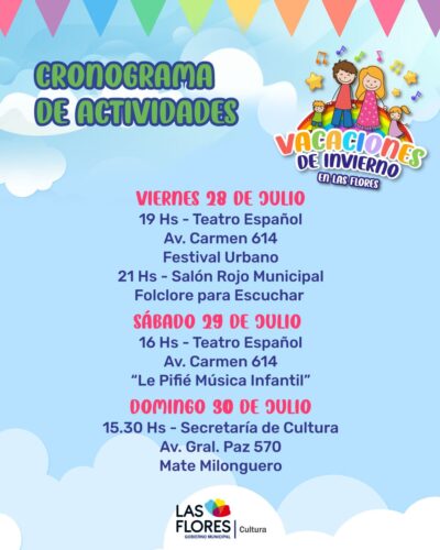 “MATE MILONGUERO” EN LA ÚLTIMA JORNADA DE CULTURA EN VACACIONES DE INVIERNO Este domingo 30 desde las 15.30 horas, en la sala Hugo Mario Ianivelli de la Secretaría de Cultura, se llevará a cabo el último evento de la nutrida agenda que mostró Cultura en estas Vacaciones de Invierno en Las Flores. “Mate Milonguero” será una jornada de tango y buena música, donde habrá también mesa dulce y sorteos entre los presentes. Se invita a la comunidad a participar. “Vení con el mate y con muchas ganas de bailar”, reza el slogan en este último encuentro, que al igual que todos los demás, será con entrada libre y gratuita.