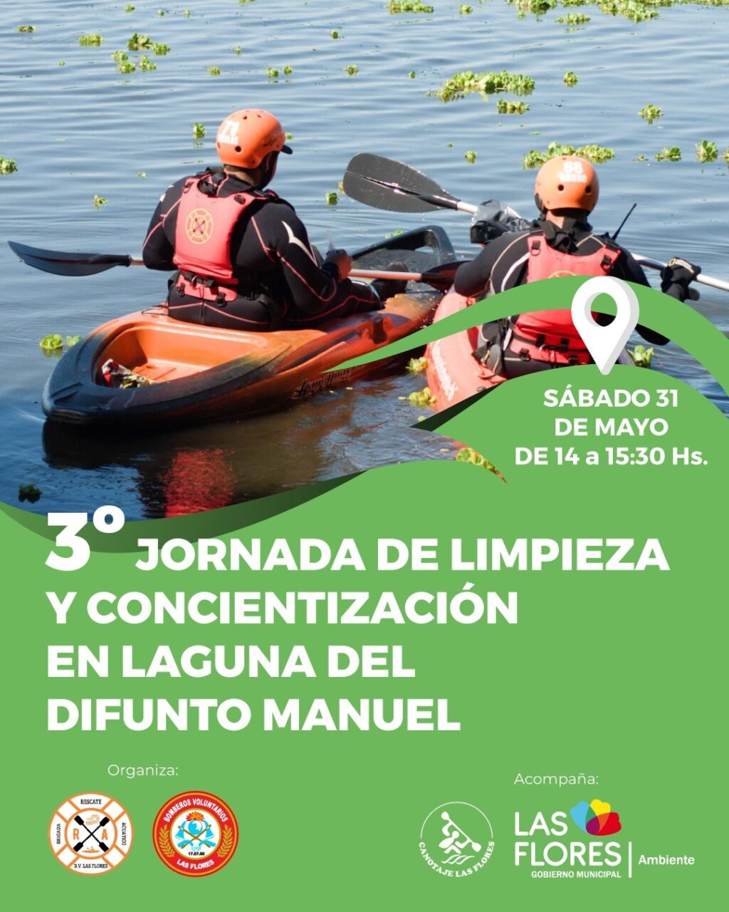 3ª JORNADA DE LIMPIEZA Y CONCIENTIZACIÓN EN LA LAGUNA DEL DIFUNTO MANUEL La Municipalidad acompaña la tercera Jornada de Limpieza y Concientización en la Laguna Difunto Manuel organizada en esta oportunidad por la Brigada de Rescate Acuático perteneciente a Bomberos Voluntarios de Las Flores. Se invita a todos los vecinos florenses a participar de esta acción que se realizará este sábado 31 de mayo de 14 a 15:30 horas. En este marco se recuerda la importancia del cuidado de nuestra laguna, de todo el Parque Plaza Montero y también la correcta disposición de los residuos urbanos para que no lleguen al espejo de agua provenientes de la ciudad. Los esperamos a todos a participar de esta jornada.