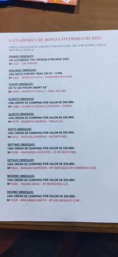 Se sorteó el pasado sábado 27 de mayo por Quiniela Nocturna de la Provincia de Buenos Aires el Bono Contribución de la entidad bomberil. El primer obsequio, un automóvil Fiat Cronos 0Km. modelo 2023, favoreció al número 5219 quedando sin vender. El segundo obsequio, una moto Corven Triax 150cc. 0Km., fue para el número 2669 y correspondió al vecino Marcelo Soto. El tercer obsequio, un TV Led Philips Smart 43» correspondió al número 5459 perteneciente a Roberto Cirulli, domiciliado en nuestra ciudad. El resto de los adjudicados fueron los siguientes: