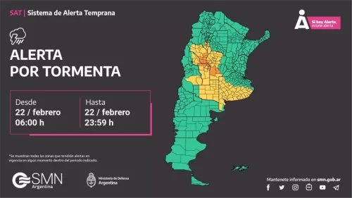 (ver informe) El Servicio Meteorológico Nacional ha emitido hace instantes un alerta amarillo para numerosos distritos de la provincia de Buenos Aires -entre ellos Las Flores- para este jueves 22 de febrero. Se prevé hacia la tarde-noche aumento de nubosidad, vientos regulares a fuertes y la llegada de lluvias y posibles tormentas, algunas localmente fuertes, con la posibilidad de caída de granizo y ráfagas intensas en áreas específicas, además de una abundante caída de agua en cortos períodos. Se estima que la precipitación acumulada oscile entre 30 y 60 mm, pudiendo superarse en zonas puntuales.