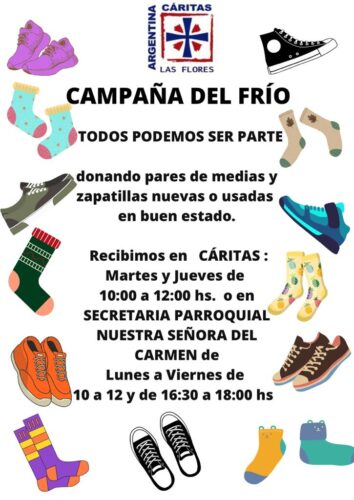 En pleno invierno con días de muy baja temperatura Cáritas local recuerda que se reciben en su sede de calle Pueyrredón casi Avda. San Martín abrigos, medias, zapatillas nuevas o usadas (en buen estado). .Las donaciones se reciben también en Secretaría Parroquial en los días y horarios incluidos en el flyer que acompaña la noticia. «Dale tu mano a quien lo necesita», manifiesta Cáritas Las Flores.