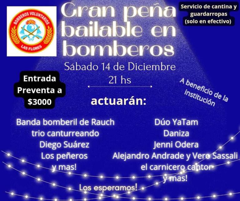 Gran peña bailable a las 21 hs. actuaran banda bomberil de Rauch, Trio Canturreando, Diego Suarez, Los Peñeros y muchos...