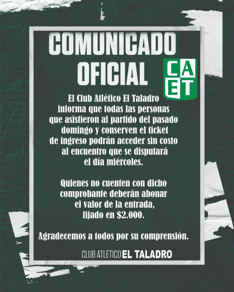 El Club Atlético El Taladro informa que todas las personas que asistieron al partido del pasado domingo y conserven el...