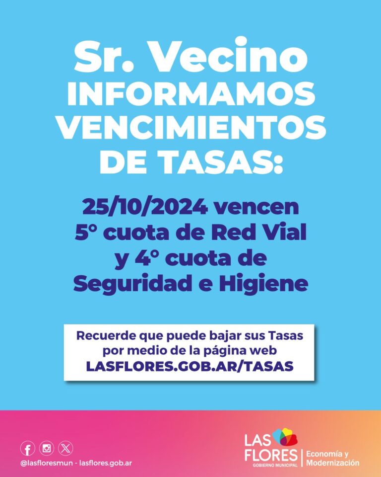 VENCIMIENTO DE TASAS MUNICIPALES La Secretaría de Economía y Modernización informa a los contribuyentes que el próximo viernes 25 de...