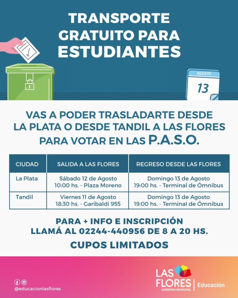 TRANSPORTE GRATUITO PARA ESTUDIANTES DE LA PLATA Y TANDIL PARA LAS P.A.S.O La Municipalidad de Las Flores informa que se...