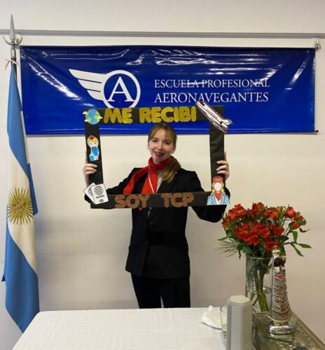 Ella tiene 18 años y egresó del secundario en la Escuela Dante Alighieri. En agosto se recibió como «Tripulante de cabina de pasajeros» en la Escuela Profesional de Aeronavegantes.