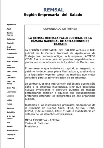 1 minuto de lecturaLa Región Empresarial del Salado rechaza el fallo judicial de la Cámara Nacional de Apelaciones de Trabajo que pretende obligar a la Empresa LACTEOS VIDAL S.A. a re-incorporar empleados despedidos de su planta industrial ubicada en la localidad de Moctezuma. «El empresario que invierte su capital, arriesgando su patrimonio debe tener plena libertad para, ajustándose a la legislación vigente, tomar las medidas que mejor considere para la administración de su empresa», indica parte del comunicado. Aquí la nota completa: