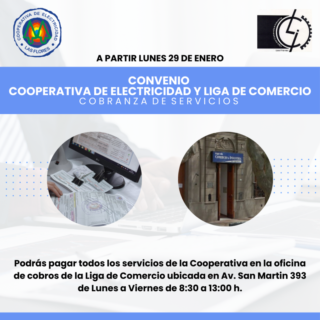 La Cooperativa de Electricidad de Las Flores y la Liga del Comercio e Industria firmaron en las últimas horas un convenio a través del cual se brindará la atención de cobranza en la Oficina de la Liga a todos los usuarios de los servicios de la Cooperativa, sean o no socios de la entidad empresaria. Esta nueva posibilidad, no implicará ningún cargo adicional para el usuario. «Este nuevo acuerdo, permitirá a los que usarán esta opción una atención rápida y eficiente», comentó en primicia este viernes el Lic. Carlos Cattorini en el programa «El Periodístico» que conduce Ernesto Varela.