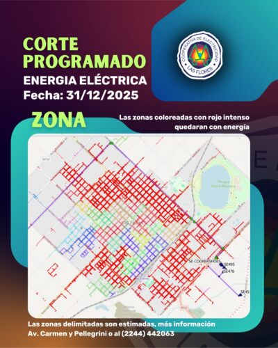 (ver imágenes) La Cooperativa de Electricidad de Las Flores informa a sus asociados que el día miércoles 31 de diciembre de 2025, en el horario de 4:30 a 06:00hs, se realizará un corte programado de energía eléctrica con el objetivo de llevar adelante tareas de mantenimiento preventivo en la red.