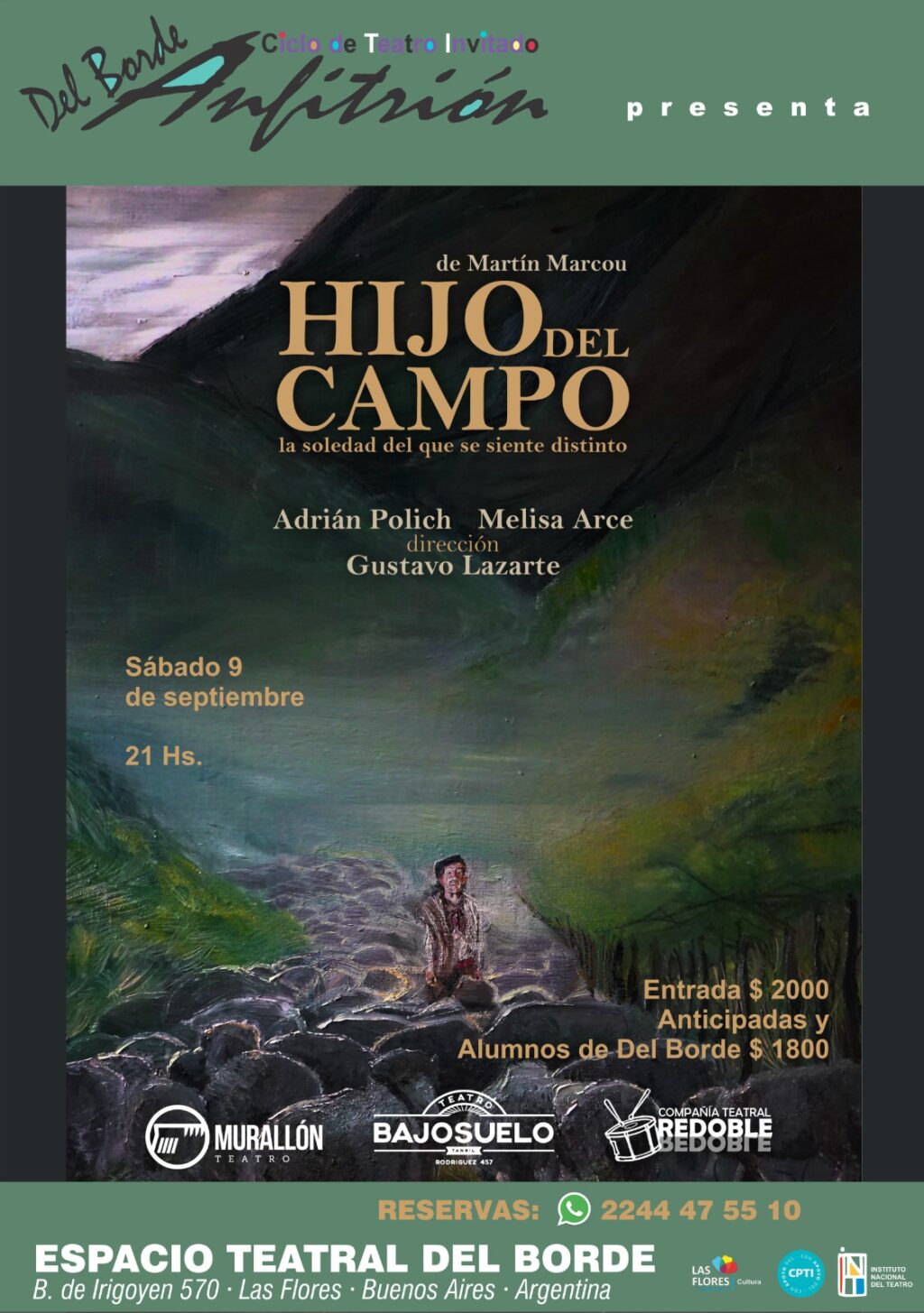 El Ciclo de Teatro Invitado Del Borde Anfitrión presenta «Hijo del campo», de Martín Marcou. Una obra sobre disidencias sexuales y patriarcado. Patagonia Argentina, mes de enero. En ese contexto campestre, mientras se desarrolla una jornada laboral, contemplamos la soledad del que se siente distinto. La obra, de tinte dramático, deconstruye la figura mítica del gaucho argentino, pone en relieve tópicos vinculados a la sexualidad y desterritorializa saberes dados sobre este personaje agenciado en las tradiciones culturales, patriarcales y muchas veces represivas. La puesta, dirigida a mayores de 13 años, se presentará el sábado 9 de septiembre a las 21 en el Espacio Teatral Del Borde (B. de Irigoyen 570, Las Flores, Buenos Aires, Argentina). Cuenta con las actuaciones de Adrián Polich y Melisa Arce, dirigidos por Gustavo Lazarte, y es una coproducción de las compañías Murallón Teatro y El Redoble, ambas de la ciudad de Tandil. La entrada tendrá un valor de $ 2000. Anticipadas $ 1800. Reservas al 2244 475510. El Espacio Teatral Del Borde cuenta con el apoyo del Instituto Nacional del Teatro, el Consejo Provincial de Teatro Independiente y la Municipalidad de Las Flores. Más información en redes: @delbordeteatro.