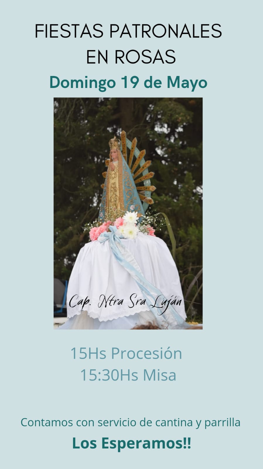 El Grupo Animador perteneciente a la Capilla «Nuestra Señora de Luján» de Rosas anunció la realización de las Fiestas Patronales que se llevarán a cabo el próximo domingo 19 de Mayo en el mencionado paraje rural. A las 15hs. se realizará la tradicional procesión por las calles de la localidad mientras que a las 15:30hs. se celebrará la Santa Misa. Se contará con servicio de cantina, parrilla, tortas y pastelitos.