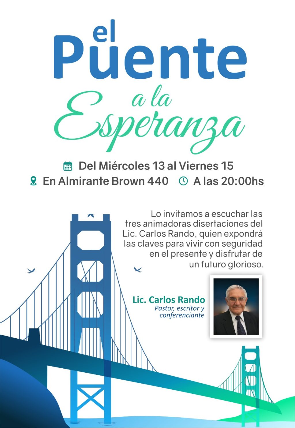Será desde este miércoles 13 al viernes 15 de diciembre a las 20hs. en Alte. Brown 440 con el Lic. Carlos Rando como disertador. Rando expondrá las claves para vivir con seguridad en el presente y disfrutar de un futuro glorioso. «Imagínese que usted está en una orilla donde todos sufren pero se ha enterado que al otro lado del río es diferente: hay abundancia, gozo, paz, salud, felicidad permanente y vida. ¿No le gustaría cruzar el puente?», indica la nota que sirve como presentación. A modo de adelanto, el Lic. Rando hablará este miércoles en la 91.5 en la mañana de la radio.