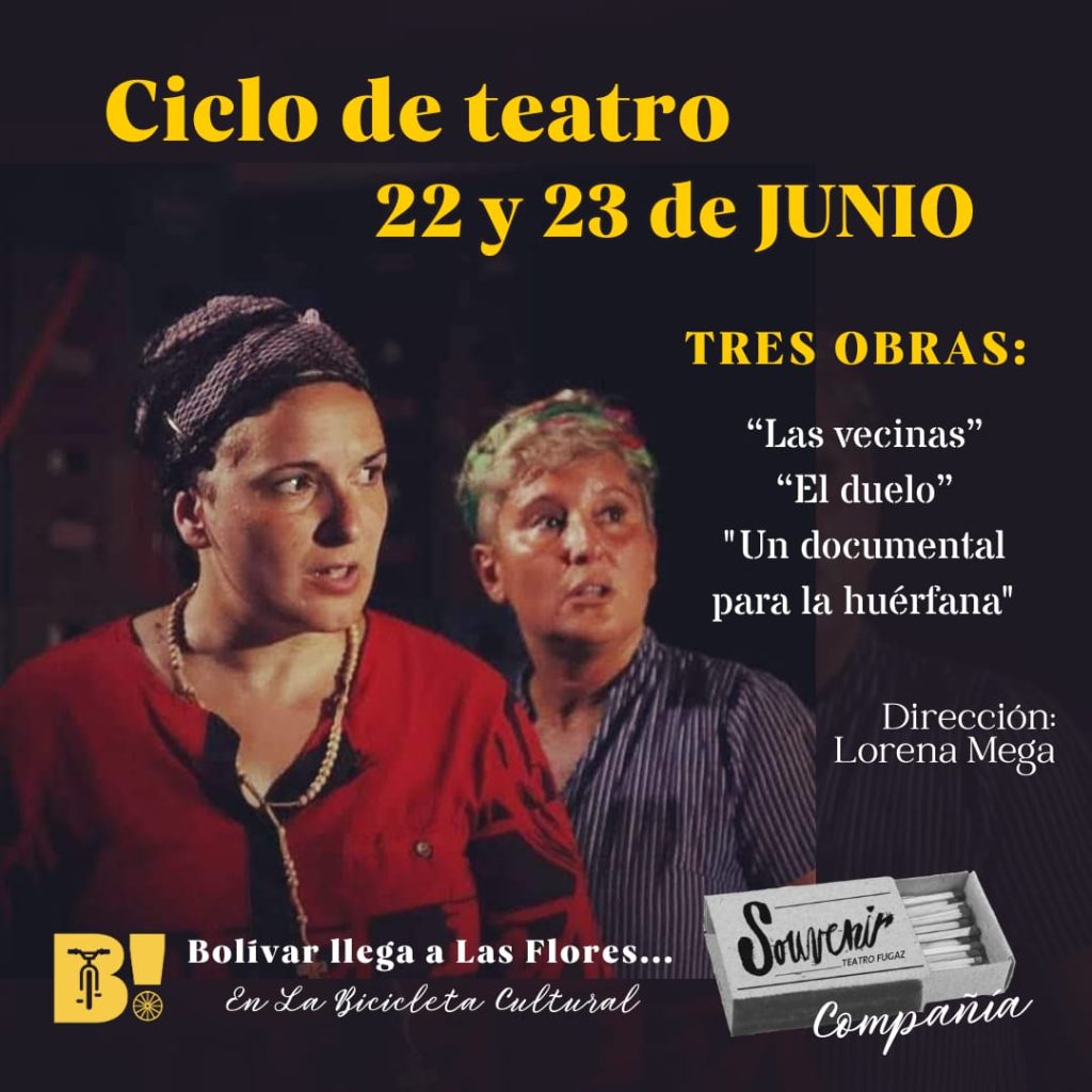 El nuevo Centro Cultural ubicado en Las Heras 730 presentará los días 22 y 23 de junio un ciclo de teatro que viene desde la vecina localidad de Bolívar. Se trata del elenco de la Companía «Souvenir» que presentará tres obras: «Las vecinas», «El duelo» y «Un documental para la huérfana». Para adquirir entradas anticipadas pueden contactarse a las redes sociales del Centro.