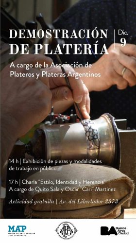 Repasando un poco el mundo de los plateros, Dino contó: «hay muchos plateros en el país, de 20 años hasta acá ha resurgido la platería, un oficio que se había perdido. Se dio con la pandemia y la reunión de grupos con la tecnología y redes sociales se formó un grupo y se hablaba de hacer una Asociación y se creó un grupo chico para ver cuáles eran los trámites necesarios y cuando había que designar gente en los distintos cargos… me eligieron como presidente al renovarse la comisión, seguí como presidente…somos casi 100 socios de todo el país, y ya tenemos la personería jurídica desde hace dos años. Eso nos costó bastante pero la conseguimos, es que queremos hacer muestras en museos nacionales y te piden un aval de tener papeles en regla y tener las cosas bien claras…la zona está muy bien porque tiene escuelas, y las principales están en Areco y Olavarría, son como polos y producción de plateros. La provincia está bien y fuerte en ese sentido, doy clases en el Taller Municipal al lado del hogar de niños y la cantidad de alumnos varía, entre 10 alumnos generalmente hay, el curso no tiene un límite, se arranca y se deja cuando uno quiere. Depende a lo que quieras llegar con la platería. Es un oficio que no tiene fin, yo hace 20 años estoy y siempre aprendo algo nuevo. En la Escuela local no se le pide nada, se le entrega todo para aprender… Muchos dicen que se necesita mucha paciencia, no sé si es tan así, cuando te ponés a cincelar las horas pasan muy rápido y si lo disfrutas se pasa muy rápido. Es como todo, si uno le pone ganas, enseguida lo disfruto. La evolución en poco tiempo de alguien que tiene ganas puede lograr cosas muy lindas…» Sobre la importancia de un buen dibujo previo, dijo: «Es básico el dibujo, la raíz del platero está en el dibujo, estoy más tiempo con el lápiz que con el martillo, luego de saber lo que quiero lo aplico, un buen dibujante tiene ya mucho terreno ganado. En mi Instagram pueden ver trabajos míos…Lo más logrado fue una obra que presenté en Brasil, es un cuchillo que disfruté mucho haciéndolo..,.» Sobre lo institucional: «Con la Asociación estamos preparando una muestra para el 9/12 en el Museo José Hernández (Buenos Aires) y el año que viene en Las Lilas en Areco y un stand en la muestra de Palermo. Son presentaciones de asociados. Remarcó Rocco.