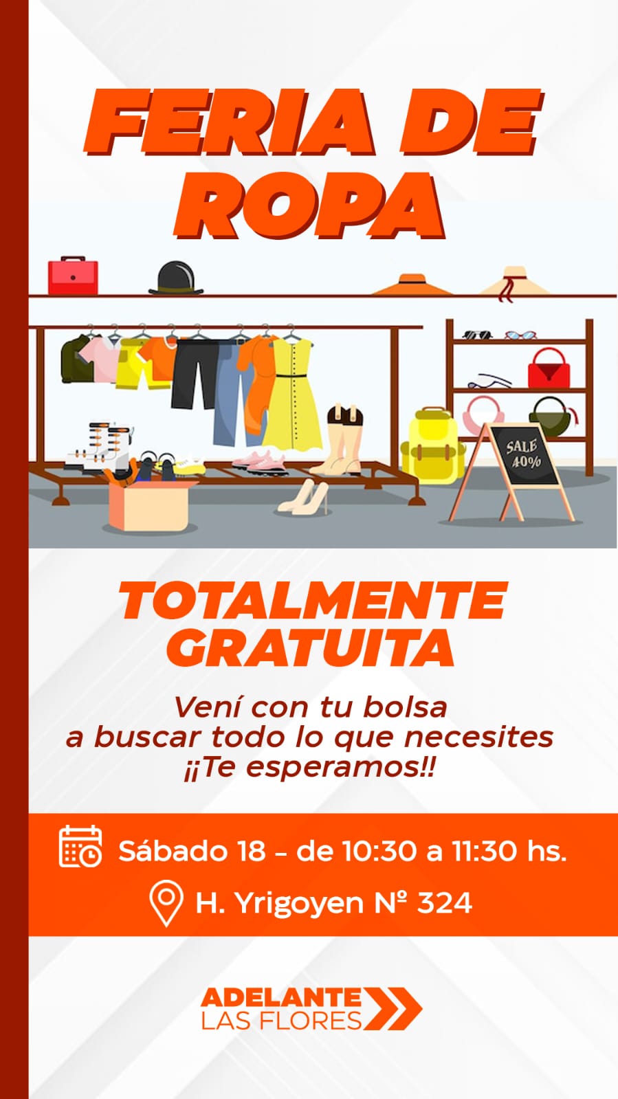 El espacio Adelante Las Flores informa que el próximo sábado 18 de abril de 10:30 a 11:30hs. en la sede de calle Hipólito Irigoyen 324 habrá una feria de prendas (adultos, niños y bebés). Es totalmente gratuita y están todos invitados.