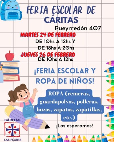 (ver flyer) La sede local de Cáritas esta organizando una feria escolar para el día martes 24 de febrero de 10 a 12hs. y de 18 a 20hs. como así también el jueves 26 de febrero de 10 a 12hs.. Habrá venta a muy buen precio de ropa y útiles escolares (remeras, guardapolvos, polleras, buzos, zapatos, zapatillas, mochilas, etc.). ¡Los esperamos!.