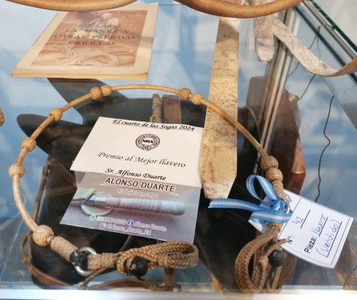 Alonso Duarte, premiado en la categoría «Soguería Criolla»: el artista florense obtuvo el primer premio en el rubro «Mejor llavero». Al hablar con FM Alpha, Duarte explicó que «Es el tercer año consecutivo que estoy presente con mis trabajos aquí en Palermo. Esta vez presentamos un llavero cuenta ganado que por lo que se ve gustó mucho al jurado. De hecho, hubo varios interesados en adquirirlo. La idea de esta creación estaba desde hace tiempo hasta que llegó la hora de aplicarla. Está trenzado con tiento de potro con un forrado especial».