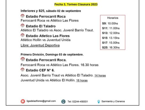 (ver cronograma de partidos) Desde las 10hs. se jugará este sábado una nueva fecha de las divisiones inferiores del fútbol local (Sub-9, Sub-11, Sub-13, Sub-15, Sub-17 y Sub-25) en diferentes escenarios. En Ferro jugarán el local ante Atlético Las Flores mientras que en el predio «Héctor Cuburú» El Taladro recibirá a Barrio Traut. Finalmente, en cancha de Atlético se enfrentarán El Hollín y Juventud Unida. Libre estará Juventud Deportiva.