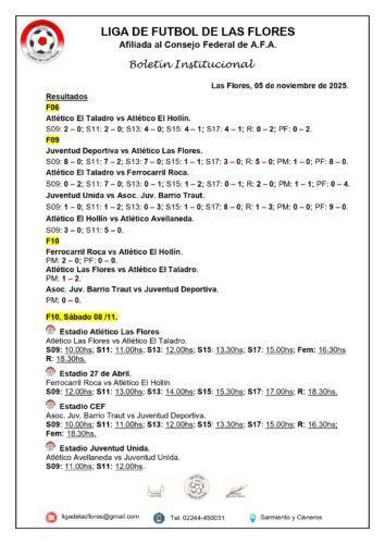 (ver programa) Desde las 10hs. se jugará este sábado la sexta fecha de la fase inicial de las divisiones inferiores del fútbol local (Sub-9, Sub-11, Sub-13, Sub-15, Sub-17, Reserva y Fútbol Femenino) en diferentes escenarios. En el estadio de Atlético, el local recibirá la visita de El Taladro mientras que en el Polideportivo de Ferro, el albiceleste se enfrentará a El Hollín. Por su parte, en el «Orestes Propato» del CEF Nro. 6, chocarán Barrio Traut-Juventud Deportiva. Finalmente, en cancha de Juventud Unida, jugarán el albirrojo ante Avellaneda únicamente en Sub-9 y Sub-11 ya que los «bichitos colorados» aún no cuentas con el resto de las categorías.