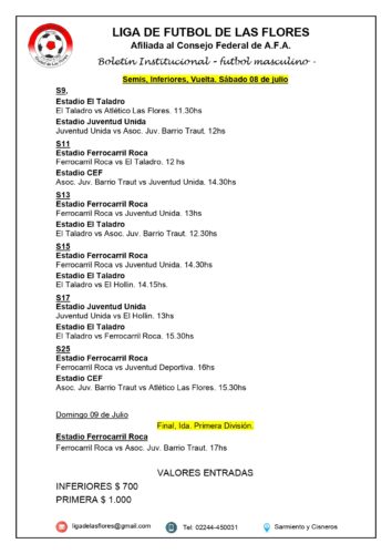 (ver cronograma de partidos) Desde las 11:30hs. y en diversos escenarios se jugarán mañana sábado los partidos de vuelta de las semifinales de todas las inferiores y Sub-25 del fútbol local. Así lo dio a conocer la Liga de Fútbol local. Habrá partidos en cancha de Ferro como así también en Juventud Unida, CEF Nro. 6 y El Taladro (Predio «Héctor Cuburú»). La jornada futbolística seguirá el domingo con las finales de ida del fútbol femenino y primera división.