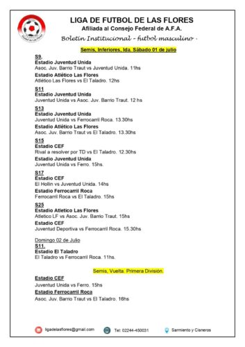 (ver cronograma de partidos) Desde las 11hs. y en diversos escenarios se jugarán mañana sábado la gran mayoría de los partidos de ida de las semifinales y Sub-25 del fútbol local. Así lo dio a conocer la Liga de Fútbol local. Habrá partidos en cancha de Juventud Unida como así también en El Taladro (Predio «Héctor Cuburú»), CEF Nro. 6 y predio del club Atlético Las Flores. Se supo también que el domingo 2 a las 9:30hs. se jugará el encuentro de Sub-11 entre El Taladro y Ferrocarril Roca siempre en instancia de semifinales.