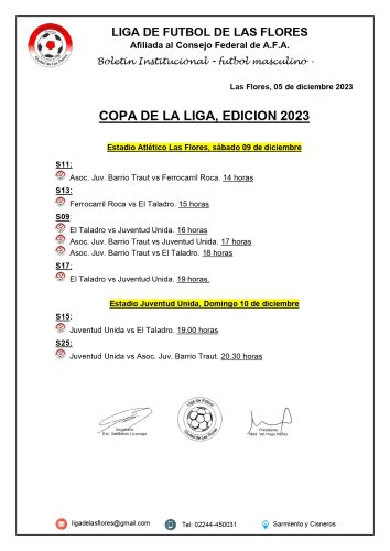 (ver programa completo) La Liga de Fútbol dio a conocer este miércoles el programa completo de partidos donde estará en juego la Copa de la Liga 2023 entre los campeones de los torneos Apertura y Clausura correspondiente a la presente temporada. Habrá encuentros desde la menor de las divisiones (Sub-9) hasta Sub-25 (ex Reserva). Por otra parte, debido a la presentación de Ferro el próximo domingo por el Torneo Regional Federal Amateur en 25 de Mayo, el partido entre albicelestes y Barrio Traut (sub-campeón del año) se disputaría recién el domingo 17 de diciembre junto al encuentro correspondiente al fútbol femenino entre El Taladro y Ferro.